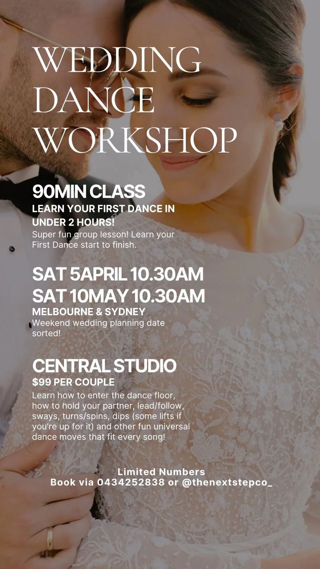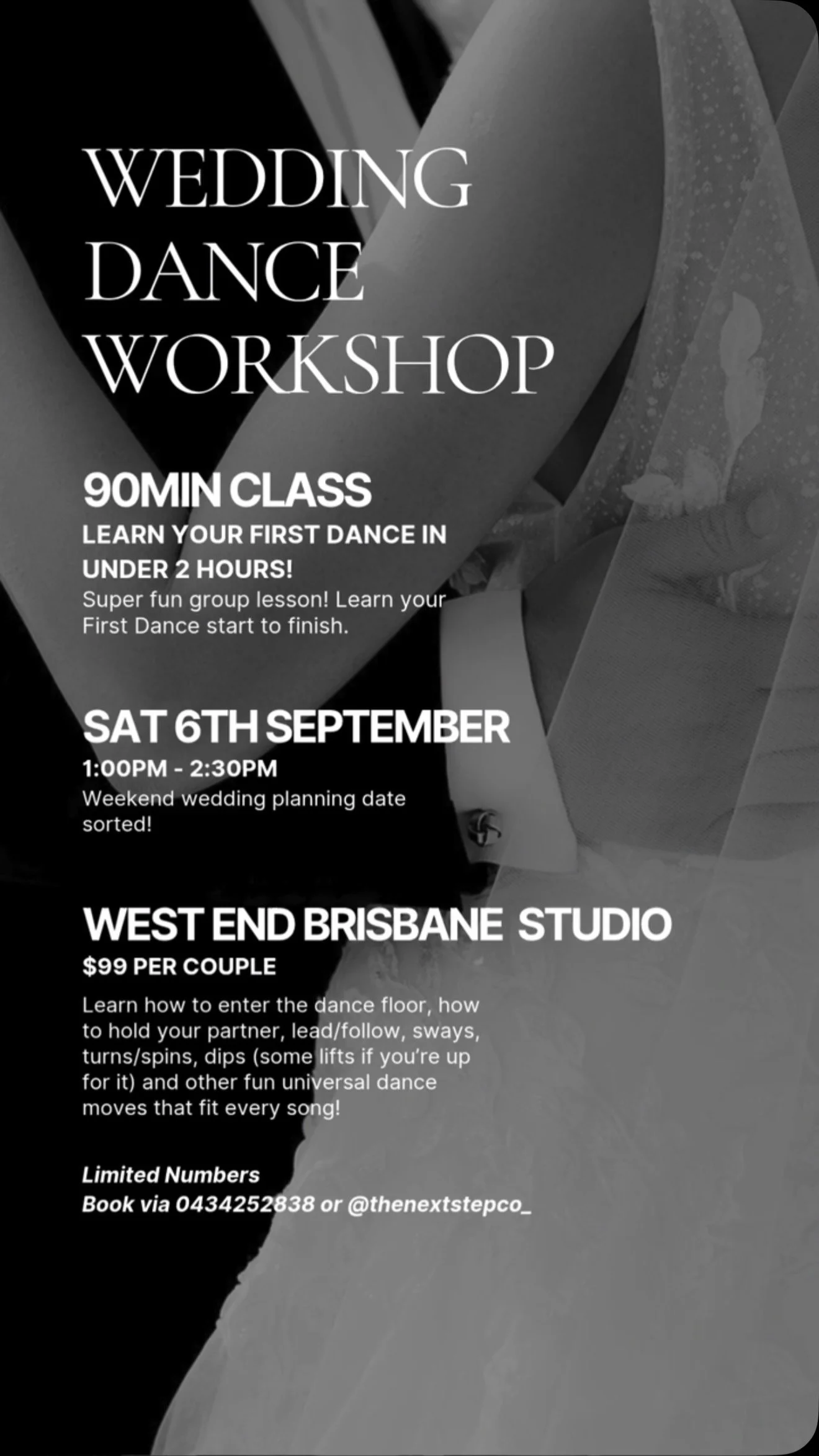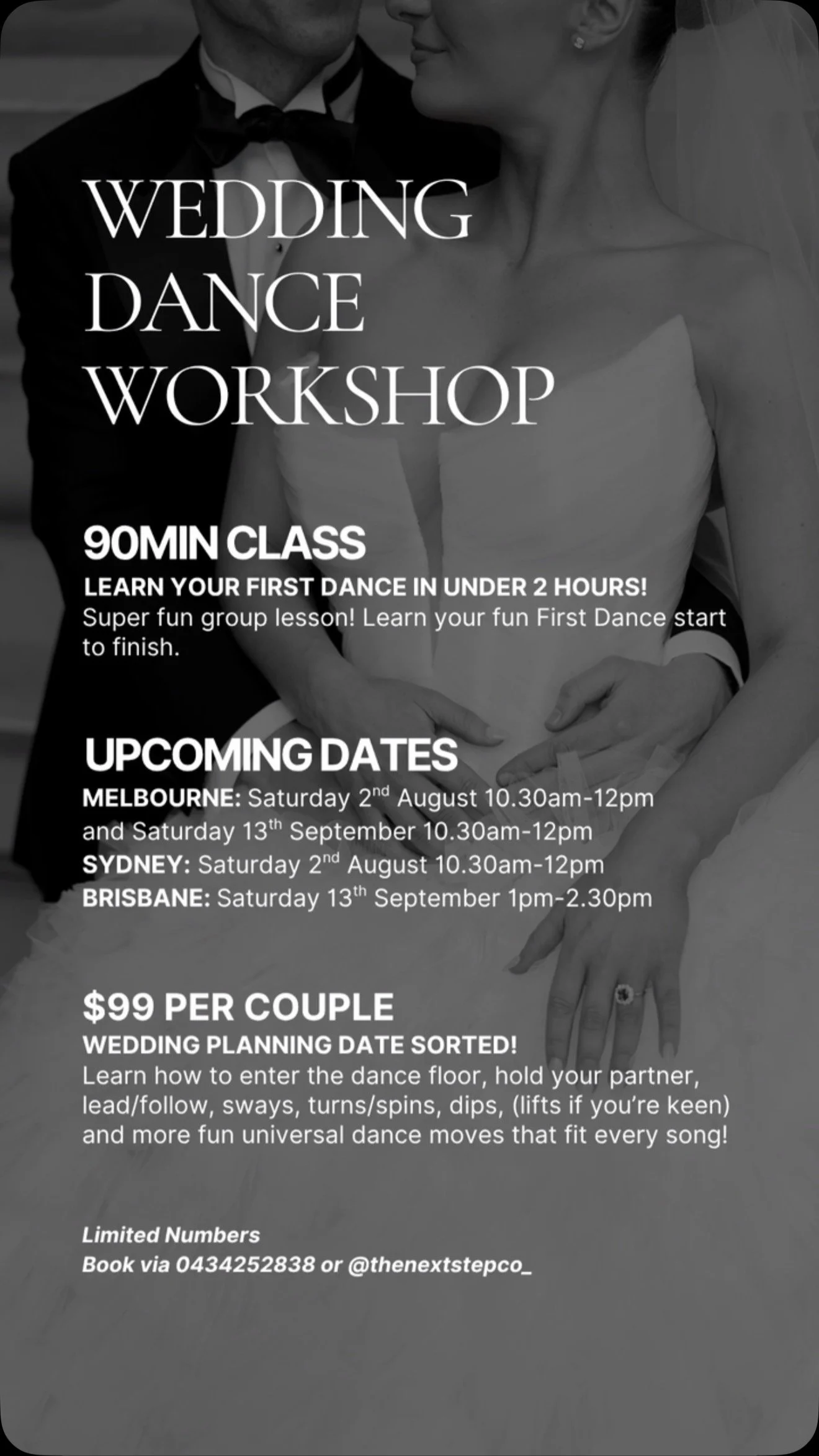 Have our expert instructors come to you in the comfort of your home for a stress free experience, accomodating those with no dance experience. Whether you are after some emergency last minute help or six months out from your wedding day; we’ll work with you to create you a wedding dance that feels right for you.